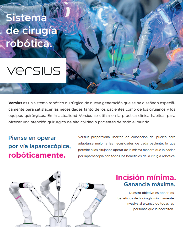 Versius es un sistema robótico quirúrgico de nueva generación que fue diseñado específicamente para satisfacer las necesidades tanto de los pacientes como de los cirujanos y los equipos médicoss. En la actualidad Versius se utiliza en la práctica clínica habitual para ofrecer una atención quirúrgica de alta calidad a pacientes de todo el mundo.